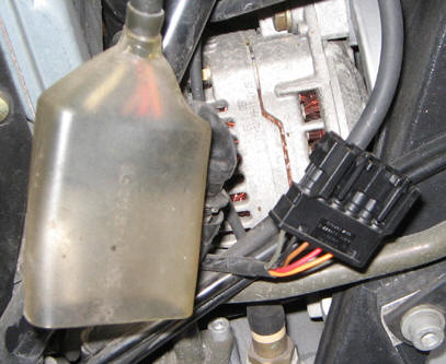 ñ Hier der Stecker des Hauptkabelbaums "auf den Rücken gedreht", und bereits das gelbe Kabel verbunden. Hier habe ich das gecrimpt mit SuperSeal-Kontakten, und dann das ganze mit Schrumpfschlauch isoliert.- Dieser Schritt ist die eigentliche Herausforderung: es ist extrem eng, das Foto ist größer als echt! Und es erfordert echt Überwindung, an einem sauteuren Kabelbaum etwas durchzukneifen... Dazu unten noch ein Wort. ñ Hier nochmals die rechte Seite: Stecker wieder am Rahmenkopf eingerastet, der andere wieder oben drauf eingerastet. Man erkennt den Schrumpfschlauch.