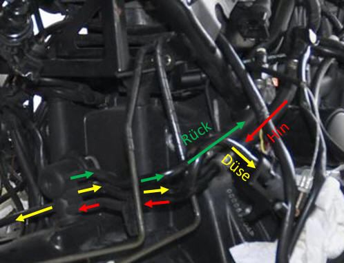 - Irgendwas gleichmässiges so dick wie ein 50 Cent-Stück (ca. 2 mm) abwinkeln und unter die Anschlagsschrauben packen. Dann beide Bypassschrauben ganz rein. Schlauchwaage oder Synchronuhren an den beiden Drosselklappen anschließen, starten und dann über den rechten Anschlag an der Schraube (die linke Schraube in Ruhe lassen!) die Schlauchwaage ausnivellieren. Grundeinstellung fertig.