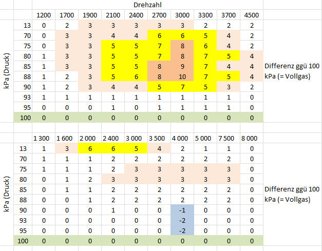 Hier dasselbe Kennfeld als Tabelle: die Linien sind eng gestaffelt im Bereich 70-100 kPa, darunter ist nur noch eine einzige Kurve bei 13 kPa. Der am genauesten definierte Bereich ist der von 85-95 kPa. 100 kPa sind nur aber eigentlich "normaler Atmosphärendruck" und somit keinerlei Unterdruck. Das würde nun nicht so recht zum bisherigen passen, wo doch immer im Niedriglastbereich der ZZP angepaßt (vorverlegt) wird.
